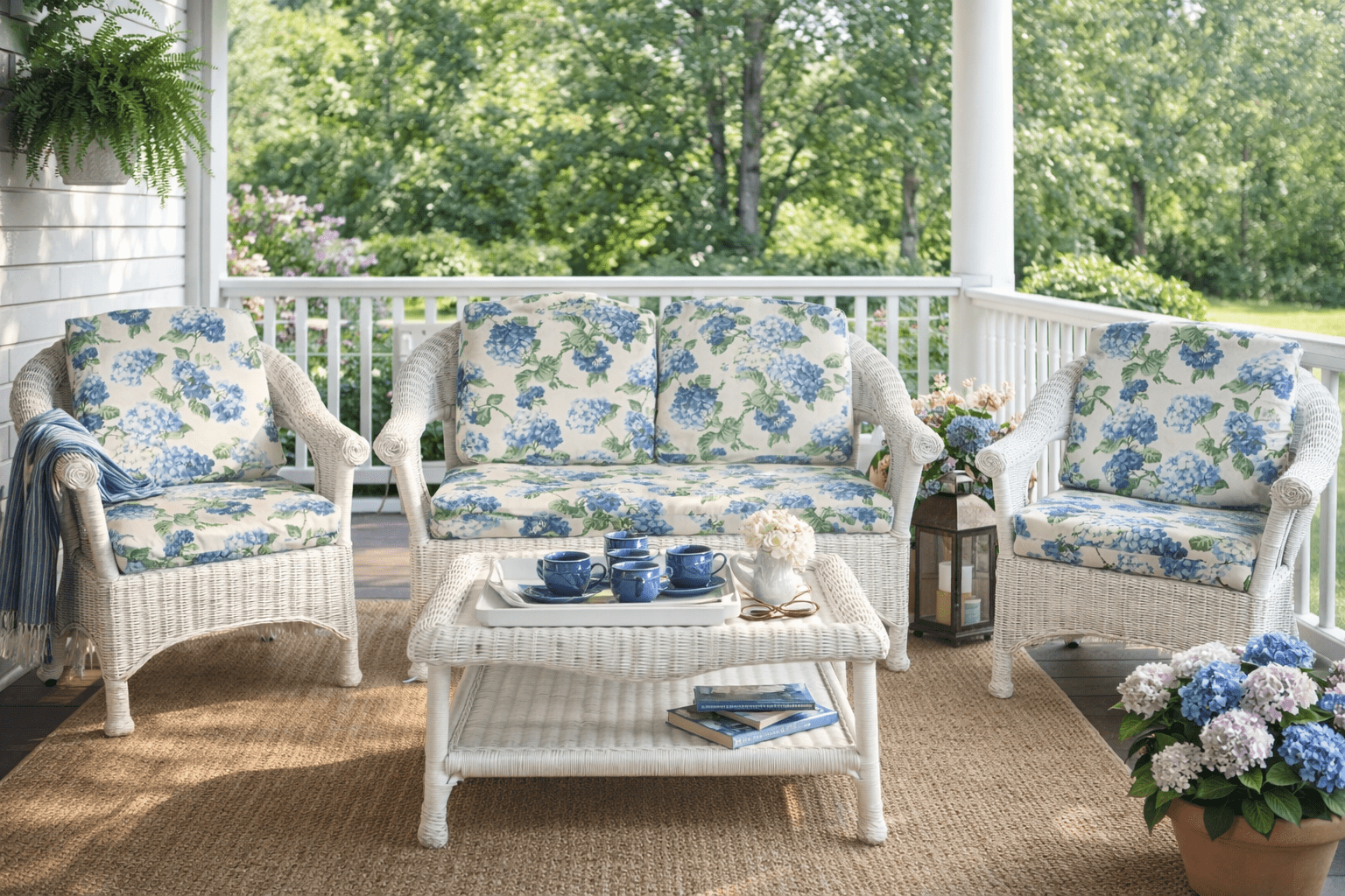 The Diamond Deep wicker collection is equally suited for a front porch or an indoor sunroom. The natural woven wicker is built on a sturdy rattan frame. US made bottom and back cushions ensure comfort at a modest price. Choose from dozens of designer inspired fabrics including Sunbrella. Make the diamond deep collection your place of respite from todays fast paced world. The Set includes 2 chairs (34w-33d-34h), 1 loveseat (57w-33d-34h), and 1 coffee table with shelf for additional storage (34w-19.5d-17h). The set is shown in Rolling Meadow Seaside fabric.