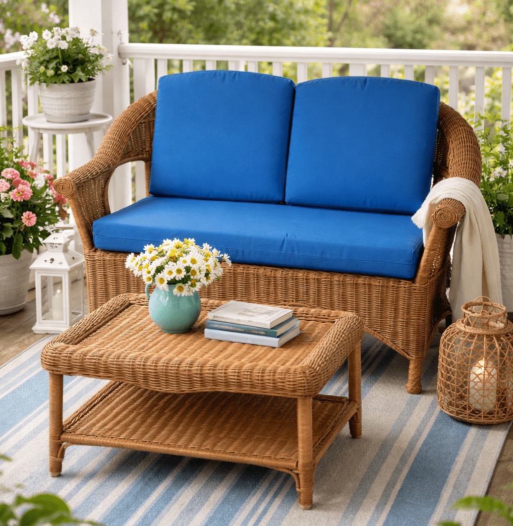 Natural wicker offers classic charm and indoor elegance. Synthetic wicker (resin) is engineered for outdoor durability and weather resistance.