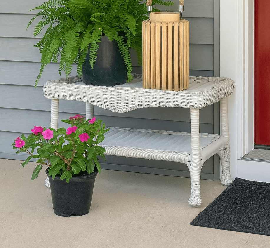 Great for front porches, screened rooms and indoor areas the diamond wicker coffee table is natural wicker on a rattan frame and includes a bottom shelf for additional storage. You can add a glass top to the table if you wish for a modest upcharge.