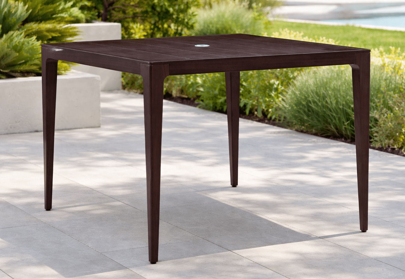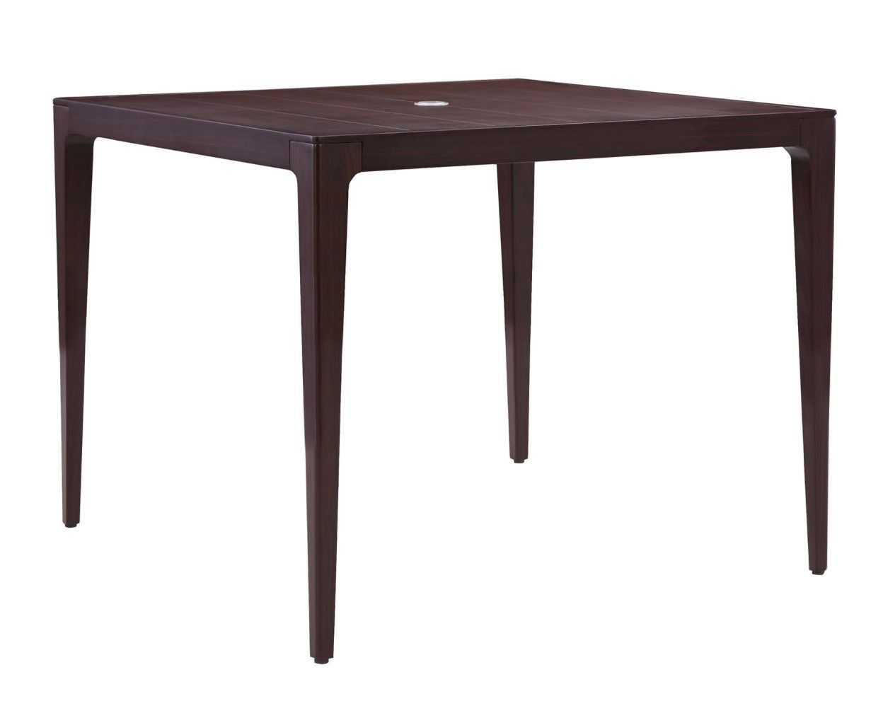 FRAME: Weather-resistant, premium powder-coated aluminum. FEATURES: Hand-rubbed finish technique that emulates a weathered look. Umbrella Hole. Seats 4 FINISH: Pre-finished in choice of Quarry Grey or Bridle.