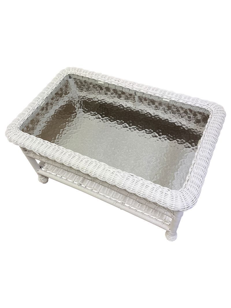 Constructed of premium quality HDPE wicker (synthetic) our Cape cod coffee table is ideal for use with young children and windy areas. A hard to find outdoor wicker coffee table that includes inset glass and a bottom shelf for convenient storage. Our coffee table has beautiful braiding and open lattice work design.