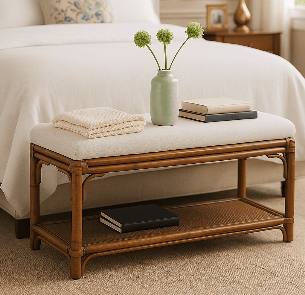 Our exclusive rattan bed bench is great for use at the foot of your bed. Choice of finish and the rattan and fabric on the stationary cushion. Comfort Plus high resilience, high performance foam cushion cores for extra support, durability, and constant comfort