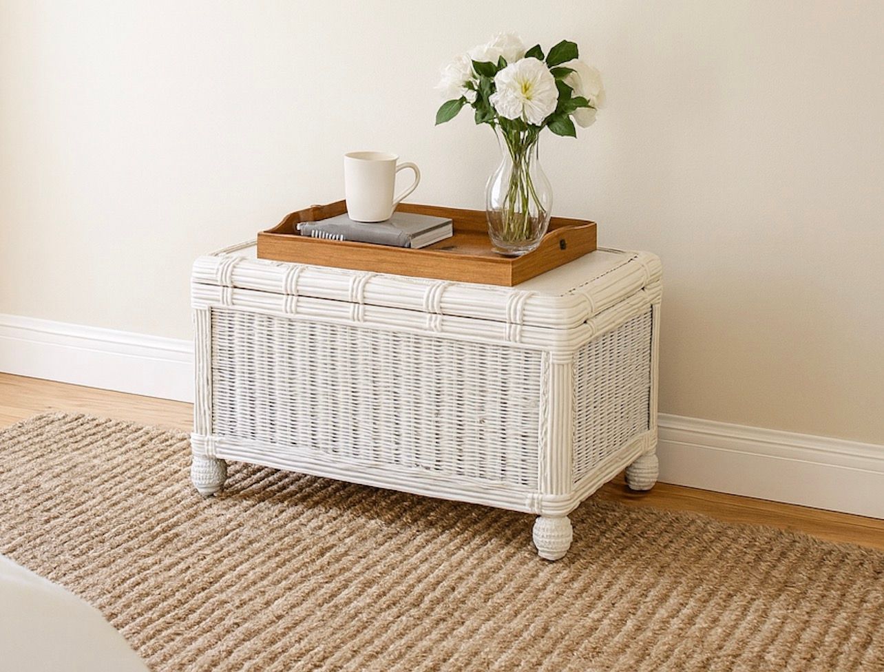 The Savannah Wicker Storage Trunk small Size is perfect for storage of toys,blankets and linens. It features inside wood lining to protect your linens and delicate items. Wicker bun feet and a distinctive rattan braid add charm to this quite functional and versatile item.