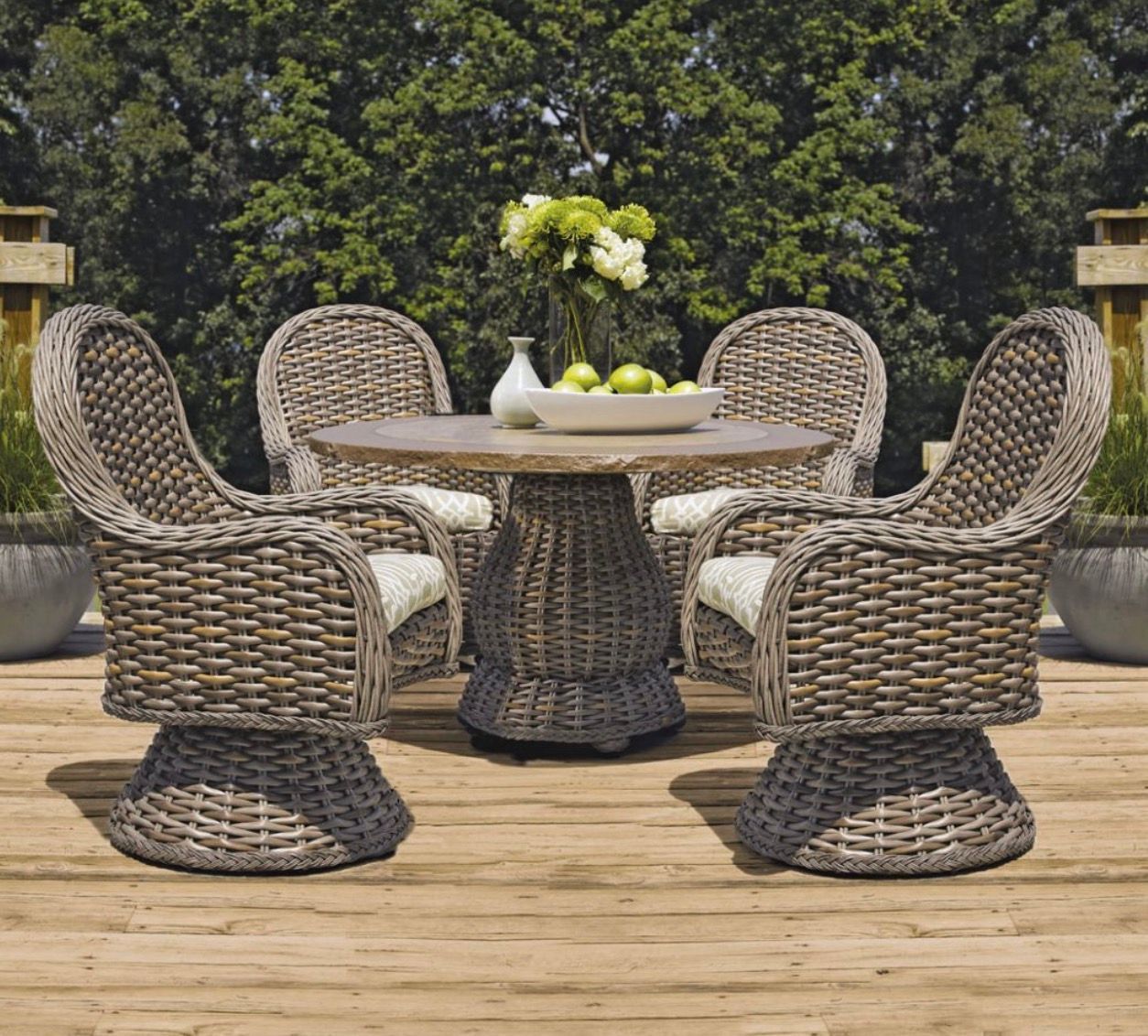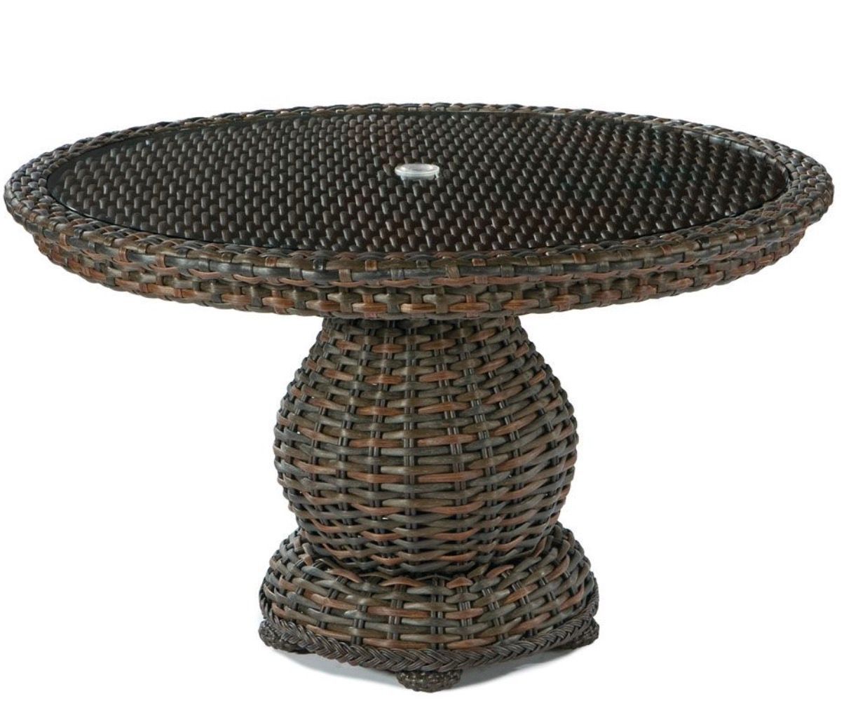 The highest quality outdoor wicker on the market Laneventure dining set of 5 is available in 2 finishes and now features a woven wicker top. There is a choice of dozens and dozens of Sunbrella fabrics.