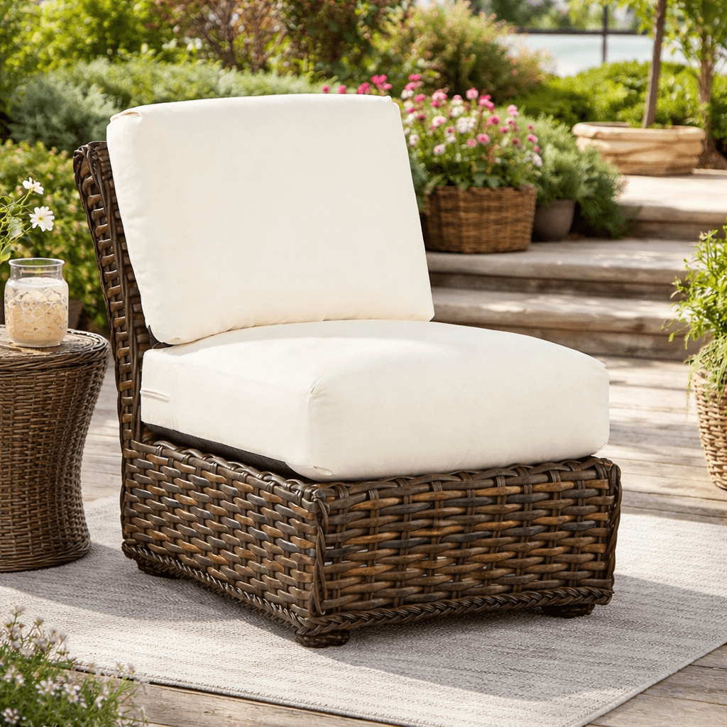 Extend your sectional with a versatile armless chair. This South Hampton wicker chair can also be paired with multiple armless units to form an armless loveseat or even a sofa. Please note cushions are all fiber outdoor fill in choice of drainable or reversible.