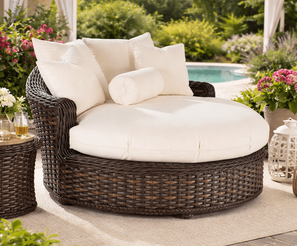 Lane Venture's South Hampton round chaise has that lavish daybed design with your choice of over 100 designer fabrics! Please note cushions are all fiber outdoor fill in choice of drainable or reversible.
