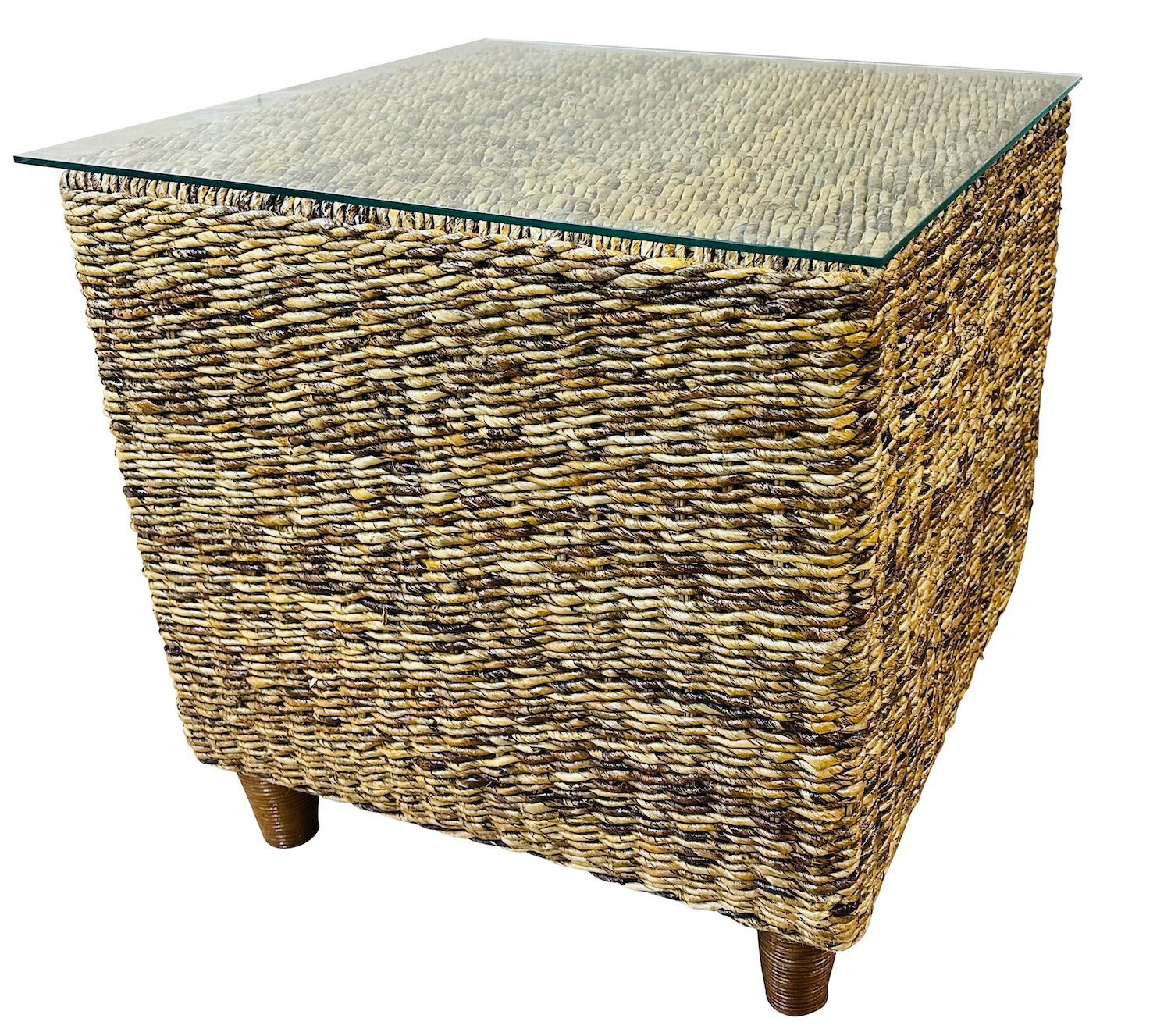 The Tangiers seagrass end table features a tempered glass top and wood feet. Includes glass top!