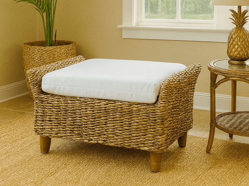 Who doesn't like to put their feet up after a long day? The Tangiers ottoman works with our other Tangiers pieces to add that extra comfort you deserve. Well constructed with woven seagrass on a hardwood frame. Please note the ottoman cushion no longer has any piping!