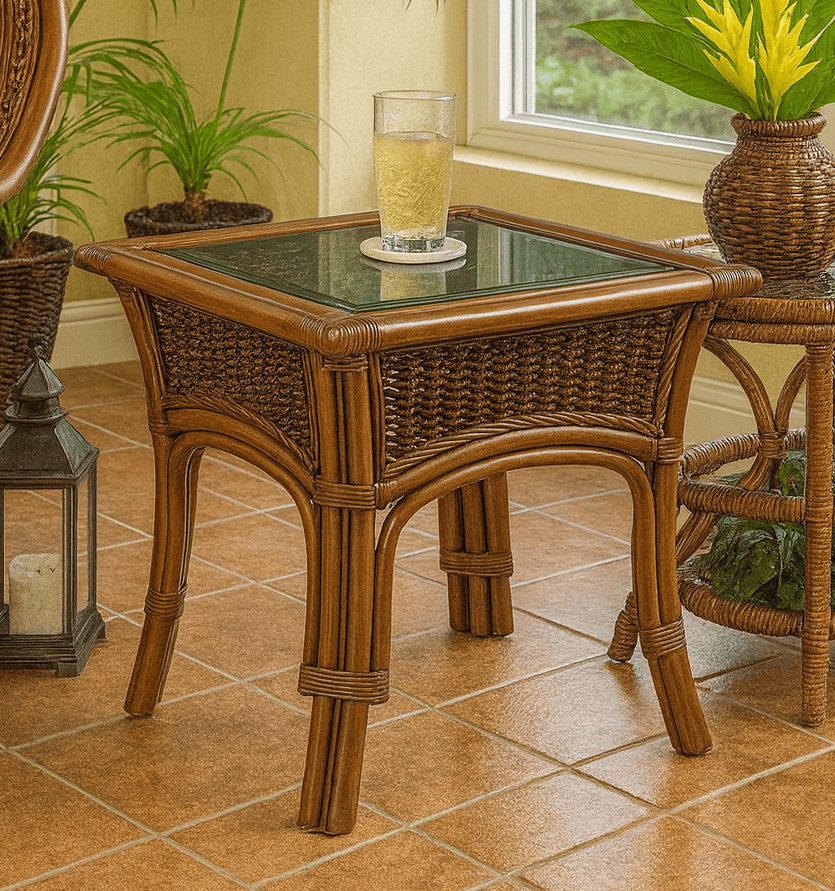 The Tigre Bay end table offers a beveled edge glass top inset into a rattan frame (for your safety) with extra bracing for support and durability. Companion to the Tigre Bay rattan sofa, chair or loveseat.