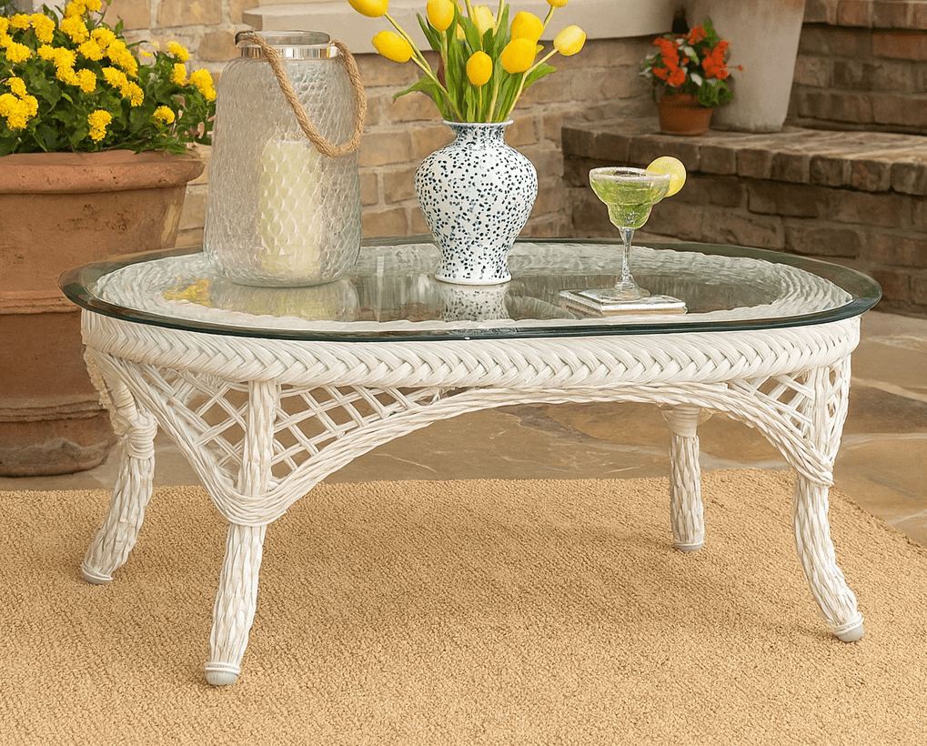 Cocktail table work great in front of the Savannah sofa. Outdoor wicker material with glass top included.