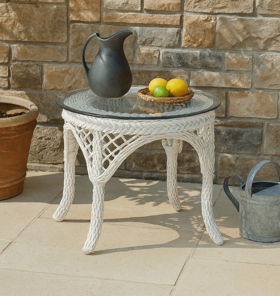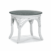 Outdoor wicker end table in the Savannah collection. Includes glass top.
