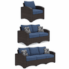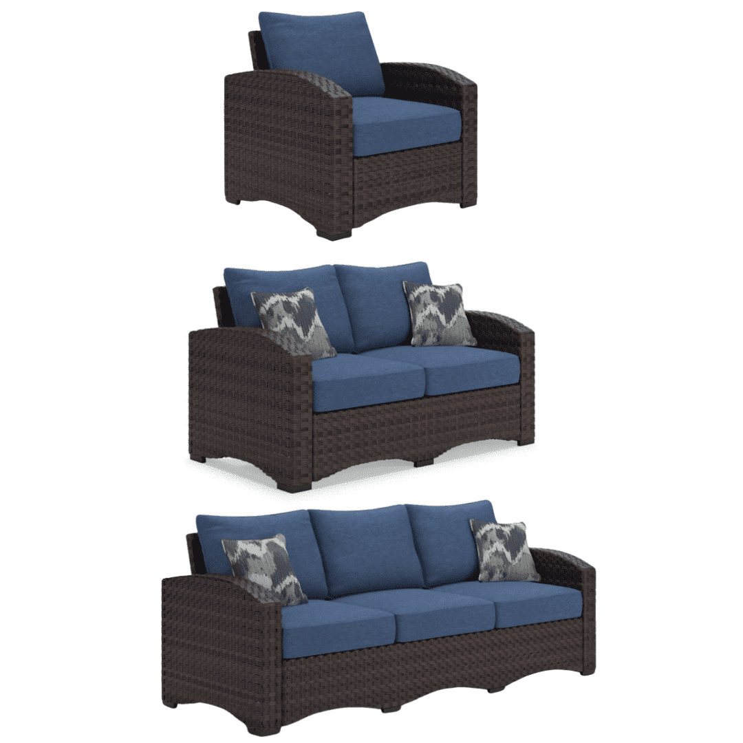 The Windglow outdoor wicker set of 3 includes 1 chair(31w-31d-36.5H), 1 loveseat(57w-31d-36.5H) and 1 sofa(81w-31d-36,5h). All pieces require assembly the blue indoor/outdoor fabric is included. You are able to add fully assembled furniture at an upcharge. Bonus throw pillows are included. No worry about rusting the frames are powder coated aluminum and the fabric is indoor/outdoor fabric.